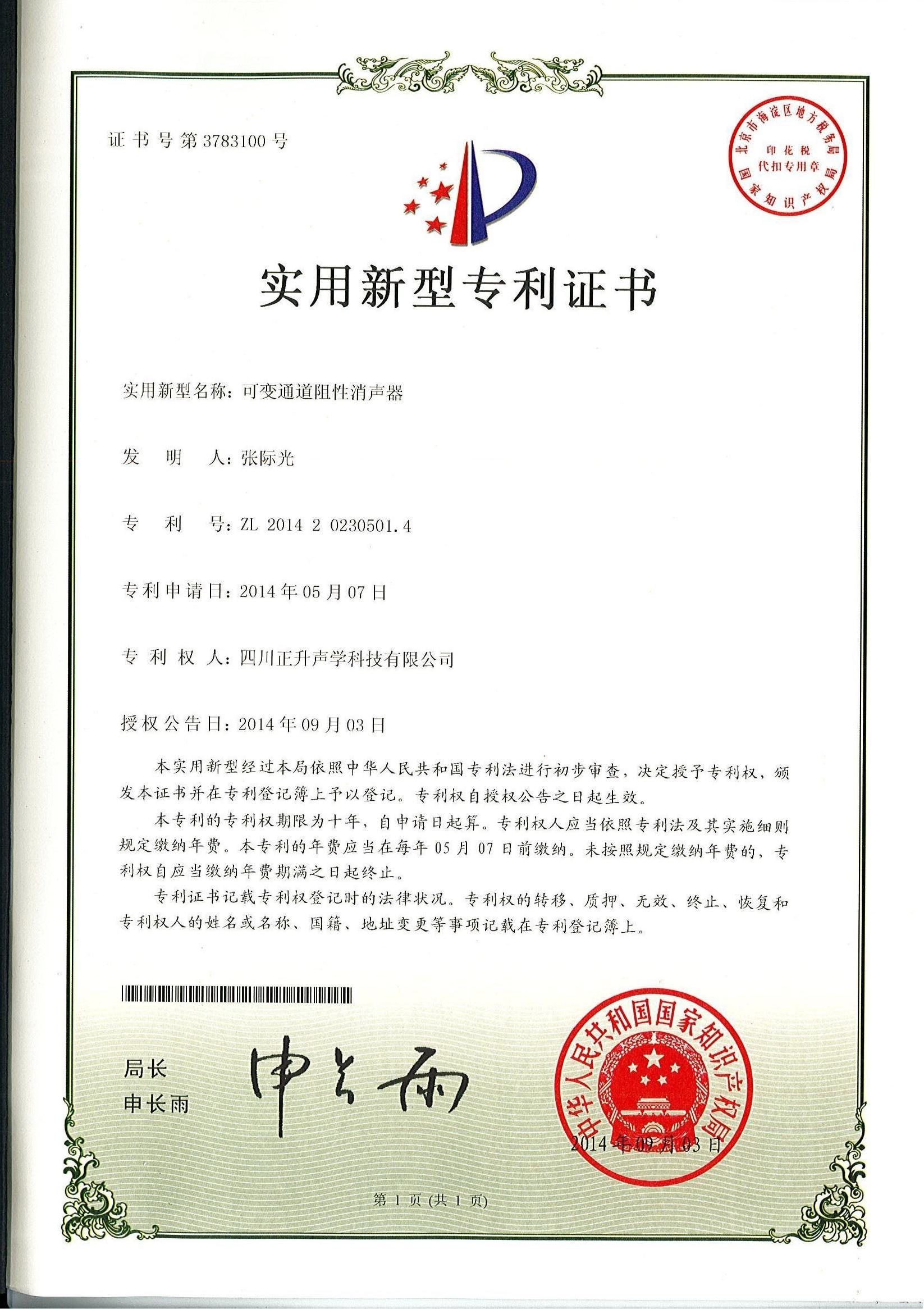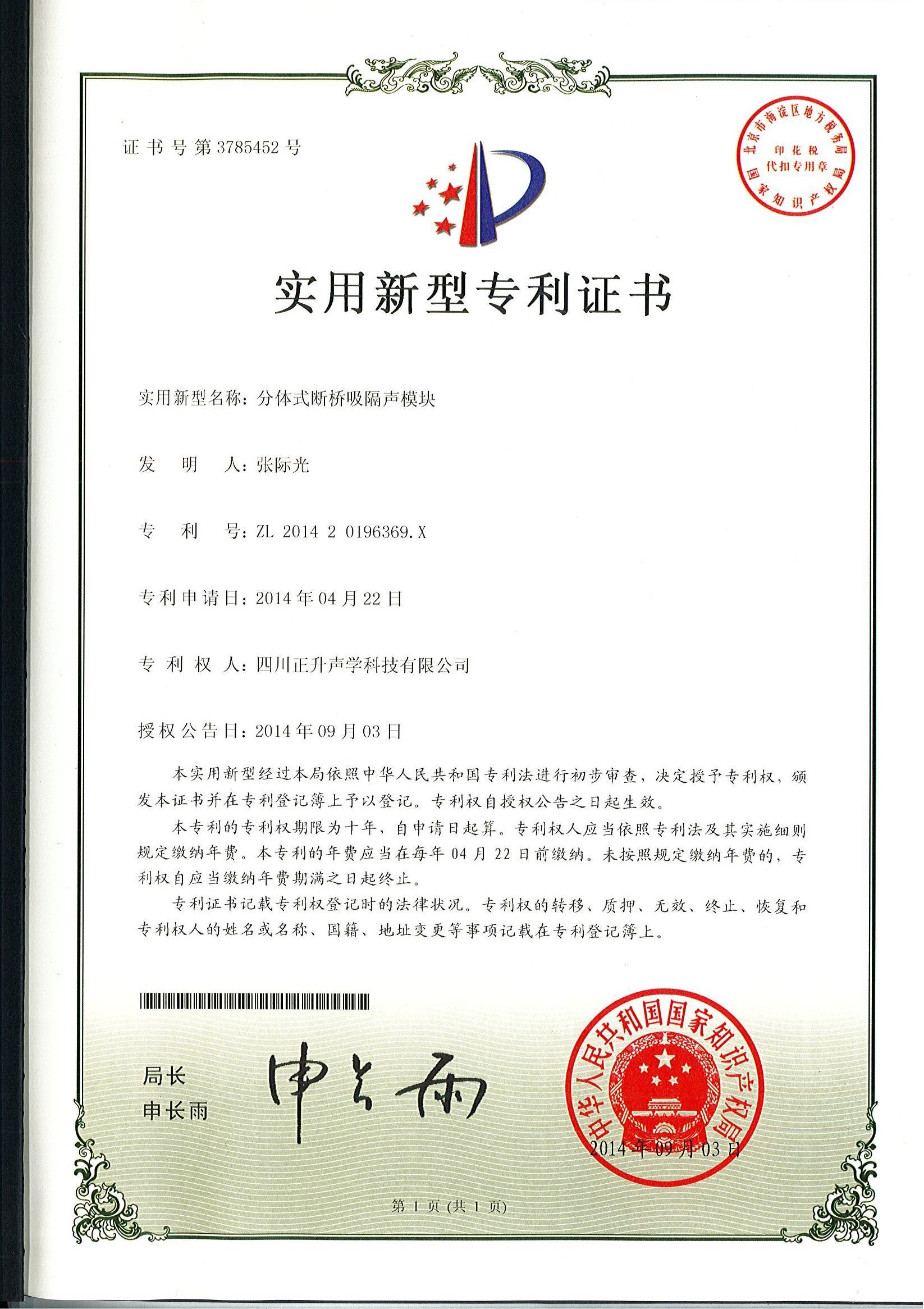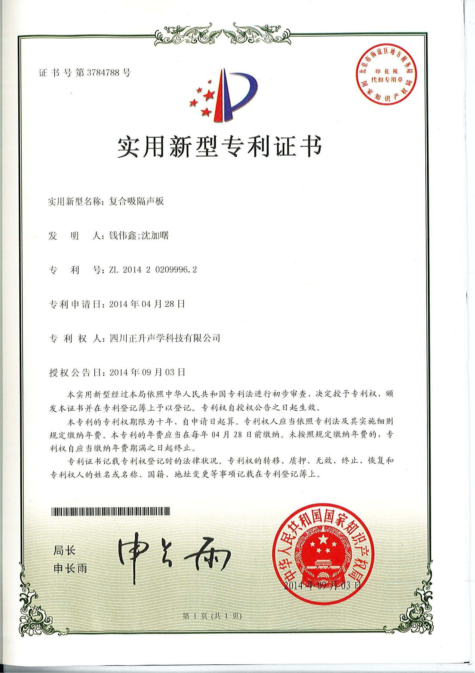 熱烈祝賀公司拆裝式斷橋吸隔聲連接件、分體式斷橋吸隔聲模塊、復合吸隔聲板、可變通道阻性消聲器等實用新型專利授權(quán)且頒發(fā)證書。
